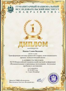С дълбока благодарност и вдъхновение Академия „Щастлив Живот“ споделя ново международно признание за научната дейност на своя основател – д-р Стояна Нацева, отличена с Диплома I степен (Първо място) за научен принос в психологията на XLVII Всеруска научна конференция „Фундаментални и приложни изследвания. Актуални проблеми и постижения“, проведена в Санкт Петербург, Русия. 🇷🇺